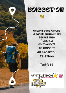 L’association Boisset’on vous invite à venir visiter son marché de Noël le 30 novembre à la salle polyvalente de Boisset de 10h00 à 17h00. Les bénéfices seront reversés au Téléthon.