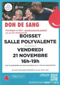 Une collecte de sang aura lieu le vendredi 21 novembre à la salle polyvalente de 16h00 à 19h00. Nous vous attendons nombreux !