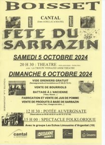 Dimanche 6 octobre : Autour du battage, l’association vous propose différentes animations comme un vide-greniers, vente de bourriols et de jus de pomme, spectacle folklorique…