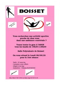La gym reprend à partir du 8 septembre tous les lundis de 19h30 à 20h30 à la salle polyvalente.