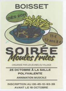 Les jeunes de Boisset vous invitent à une soirée moules frites le 25 octobre.