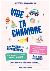 L’APE de l’école Antonin Malroux organise un Vide ta chambre le dimanche 16 novembre de 9h00 à 17h00 à la salle polyvalente.