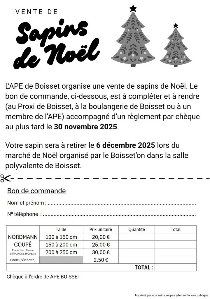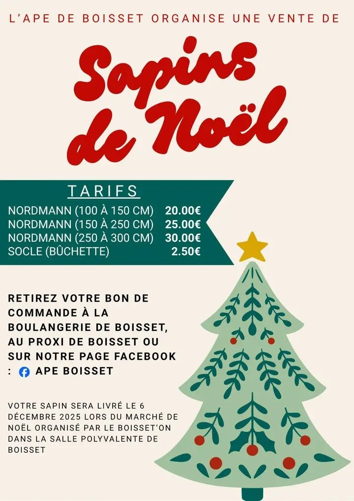 9 novembre 2025 - Sur Mairie Par webmaster Commentaire Vente de sapin L’APE de Boisset vous propose une vente de sapin jusqu’au 30 novembre. Livraison prévue le 6 décembre. Précédent Cérémonie d’hommage