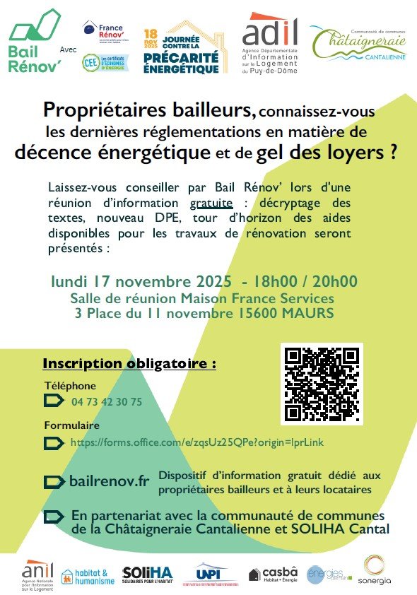 La Communauté de communes de la Châtaigneraie Cantalienne, l’opérateur SOLIHA, et l’Association Départementale d’Information sur le Logement (ADIL) du Puy-de-Dôme, organisent, dans le cadre du dispositif Bail Rénov’ une réunion de sensibilisation sur le thème de l’habitat à destination des propriétaires bailleurs du territoire :