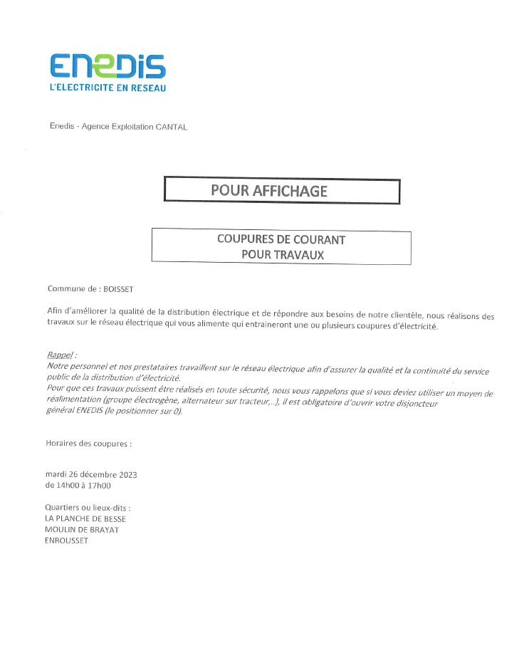 19 décembre 2023 - Sur Travaux Par webmaster Commentaire Travaux Enedis En raison de travaux, une coupure de courant aura lieu le 26 décembre après-midi. Voir le courrier ci-dessous Précédent Les marchés de Noël en Châtaigneraie Suivant Fermetures
